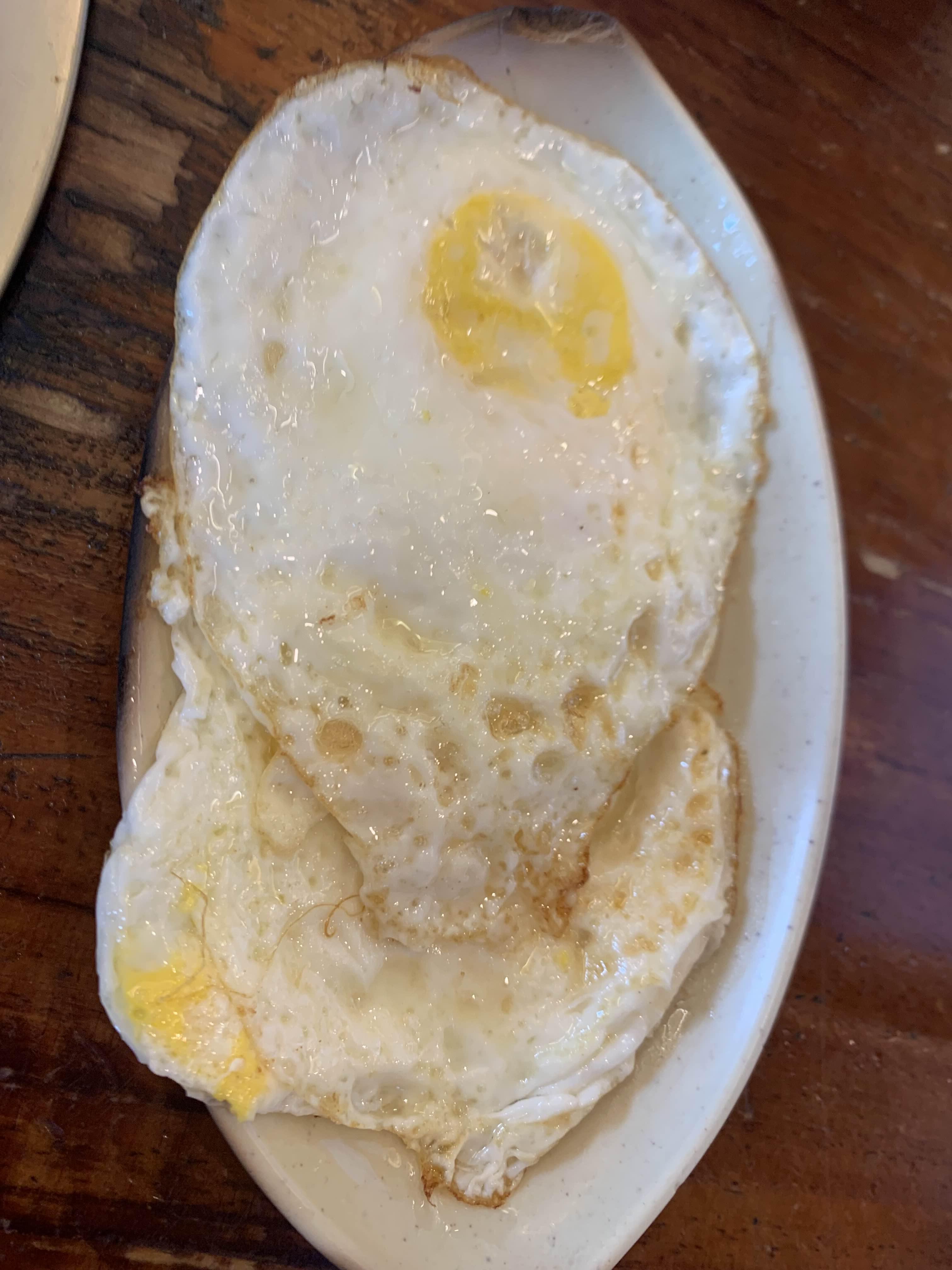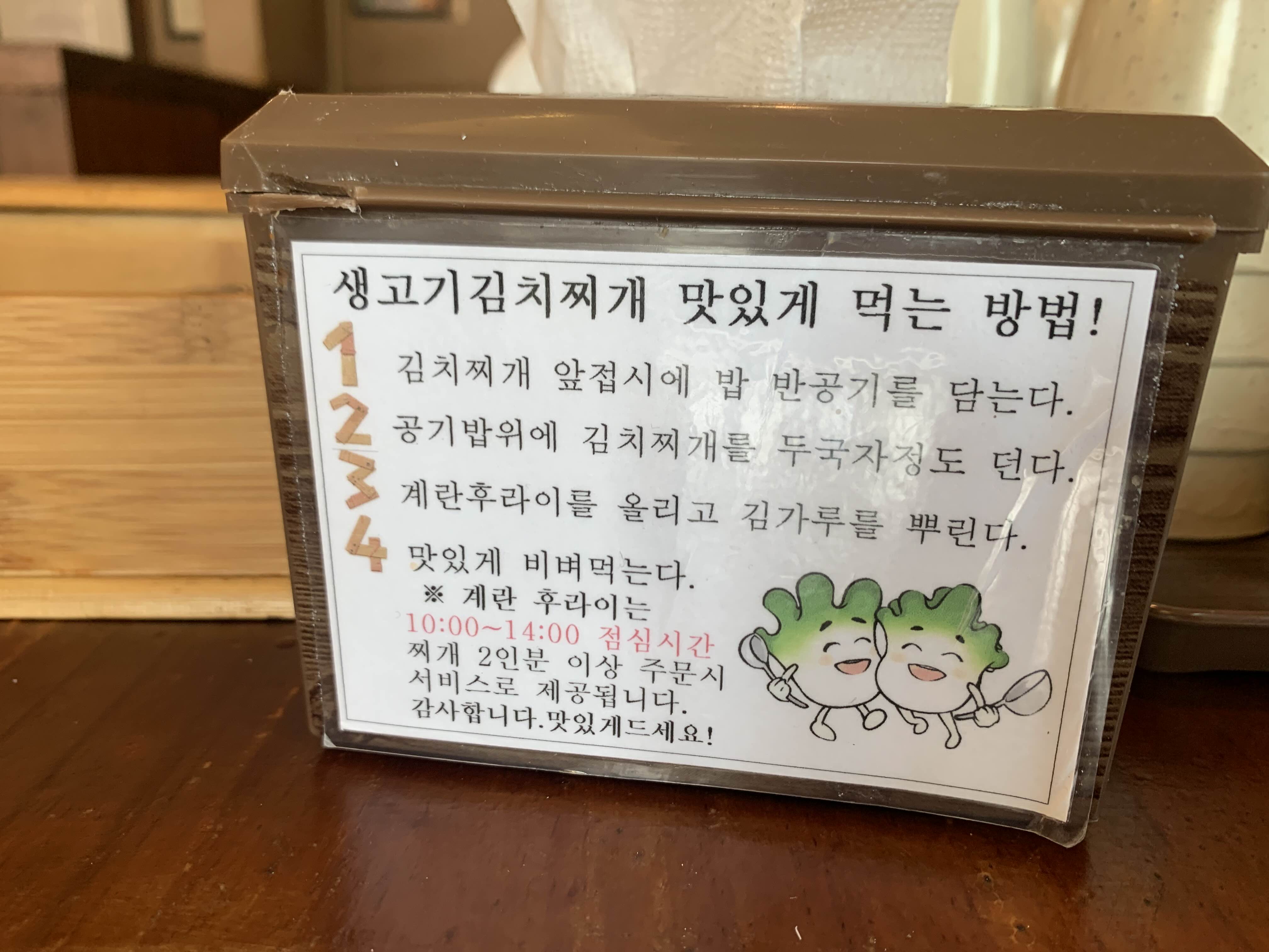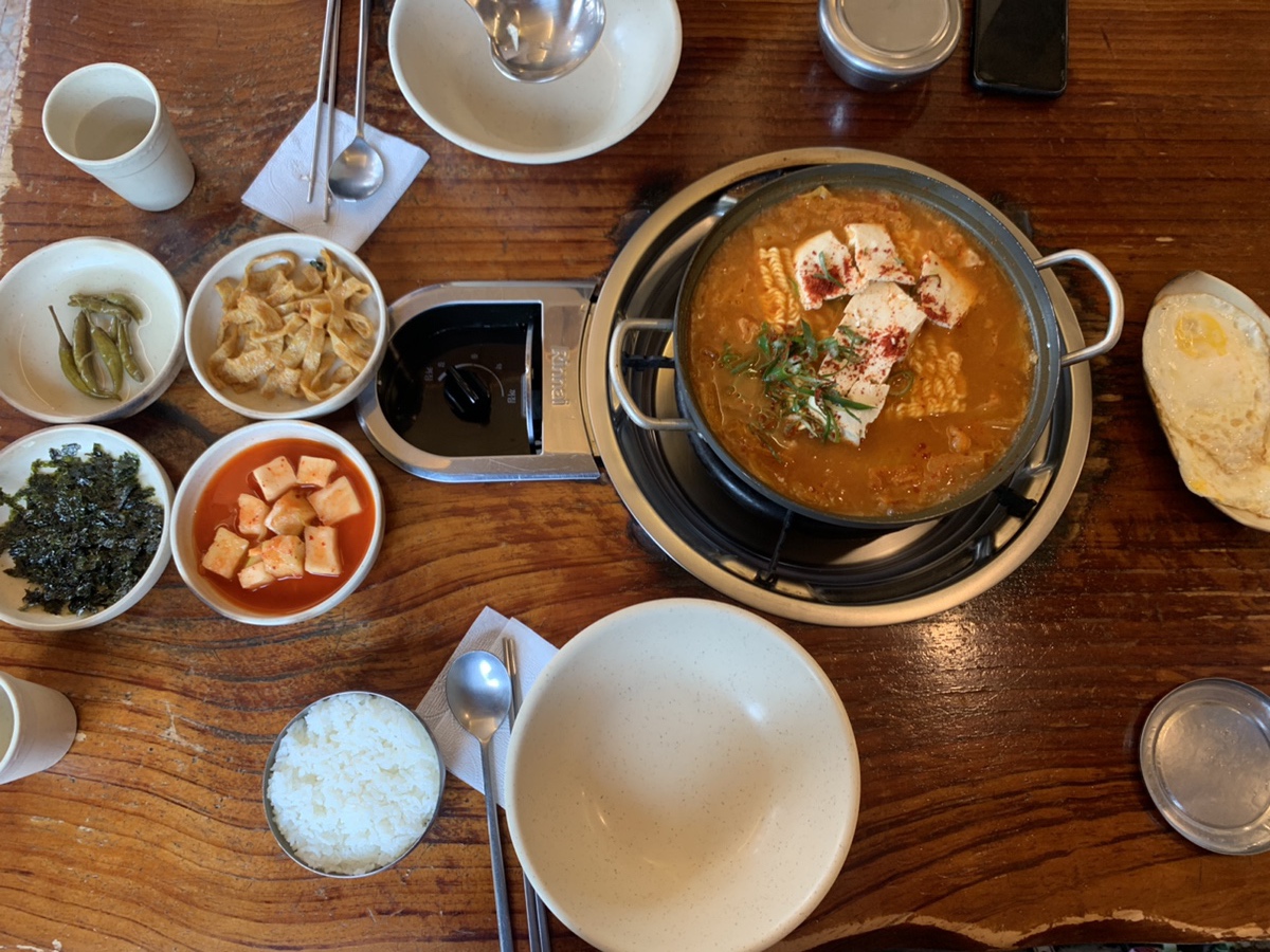 우리가 점심시간에 2인분을 주문해서 계란후라이 2개를 받았다. 짝꿍은 매번 밤에 와서 낮에 계란후라이가 나오는 줄 몰랐다고 했다. 짝꿍은 옆에 나와있는데로 맛있게 먹는 방법대로 먹었고, 나는 그냥 국물을 떠서 먹어다. 김치찌개의 원조 같은 맛이라고나 할까? 큰 자극이 없으면서도 깔끔하고 깊은 맛이 나는 국물맛이 좋았다.