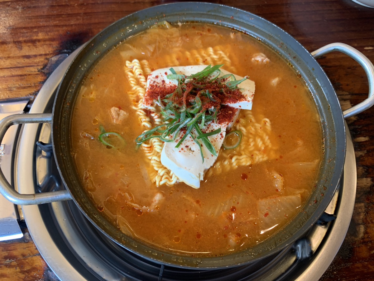 이미 김치찌개는 거의 다 끓여져서 나와서 바로 먹어도 되지만, 라면이 안 익어서 라면만 다 익으면 바로 먹어도 된다고 했다. 라면이 끓자, 라면부터 클리어!!!