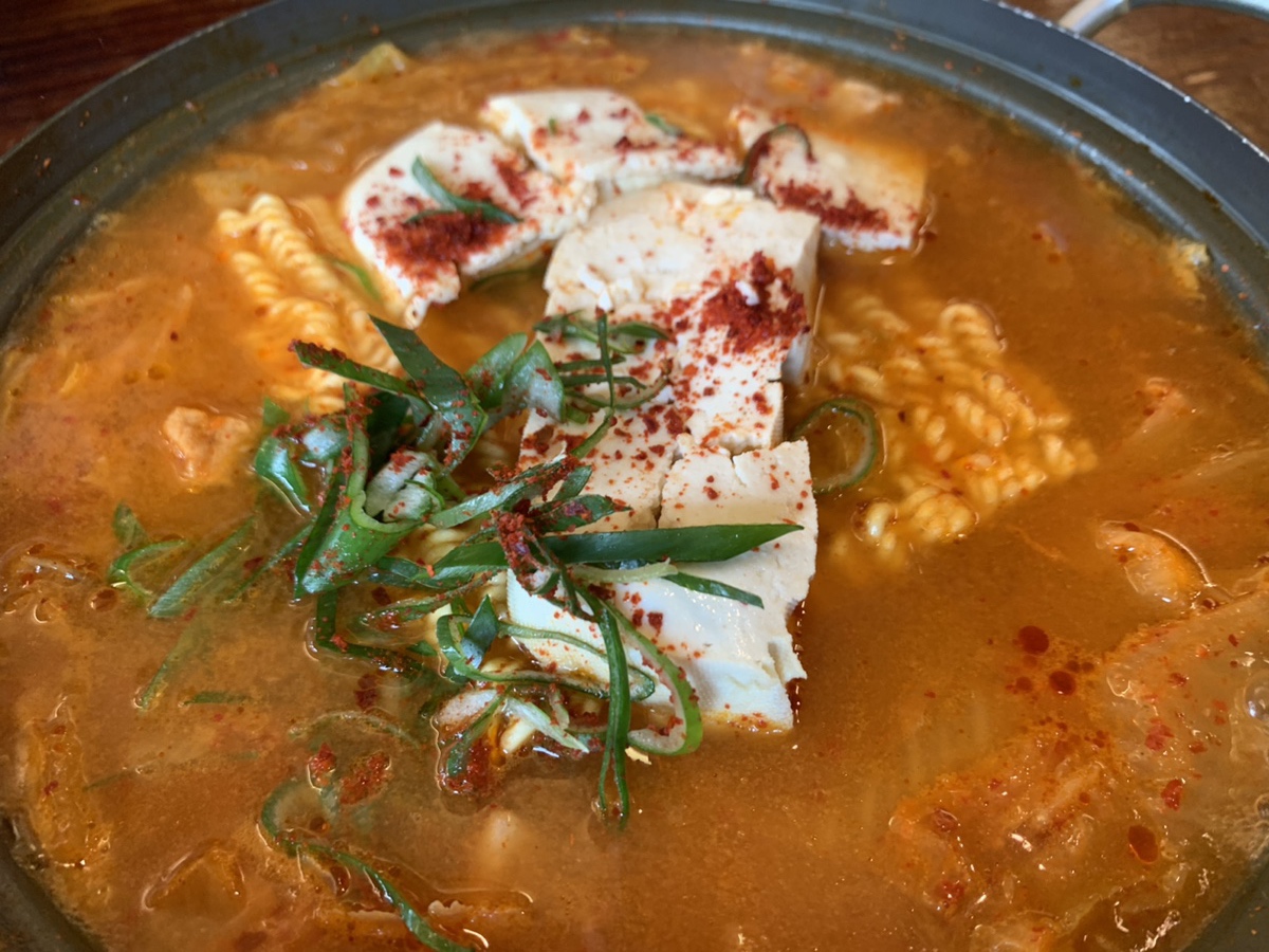 따뜻한 벚꽃이 흩날리는 합정길을 걸으면서 가게로 들어갔다. 아직 손님들이 많이 없는 시간이여서 한가했다. 밤에는 삼겹살 먹는 손님들도 많은 가게인데 낮이니까 우리는 김치찌개만 2인분 주문했다. 그리고 부대찌개 스타일처럼 먹기 위해서 라면사리도 1인분 추가 했다