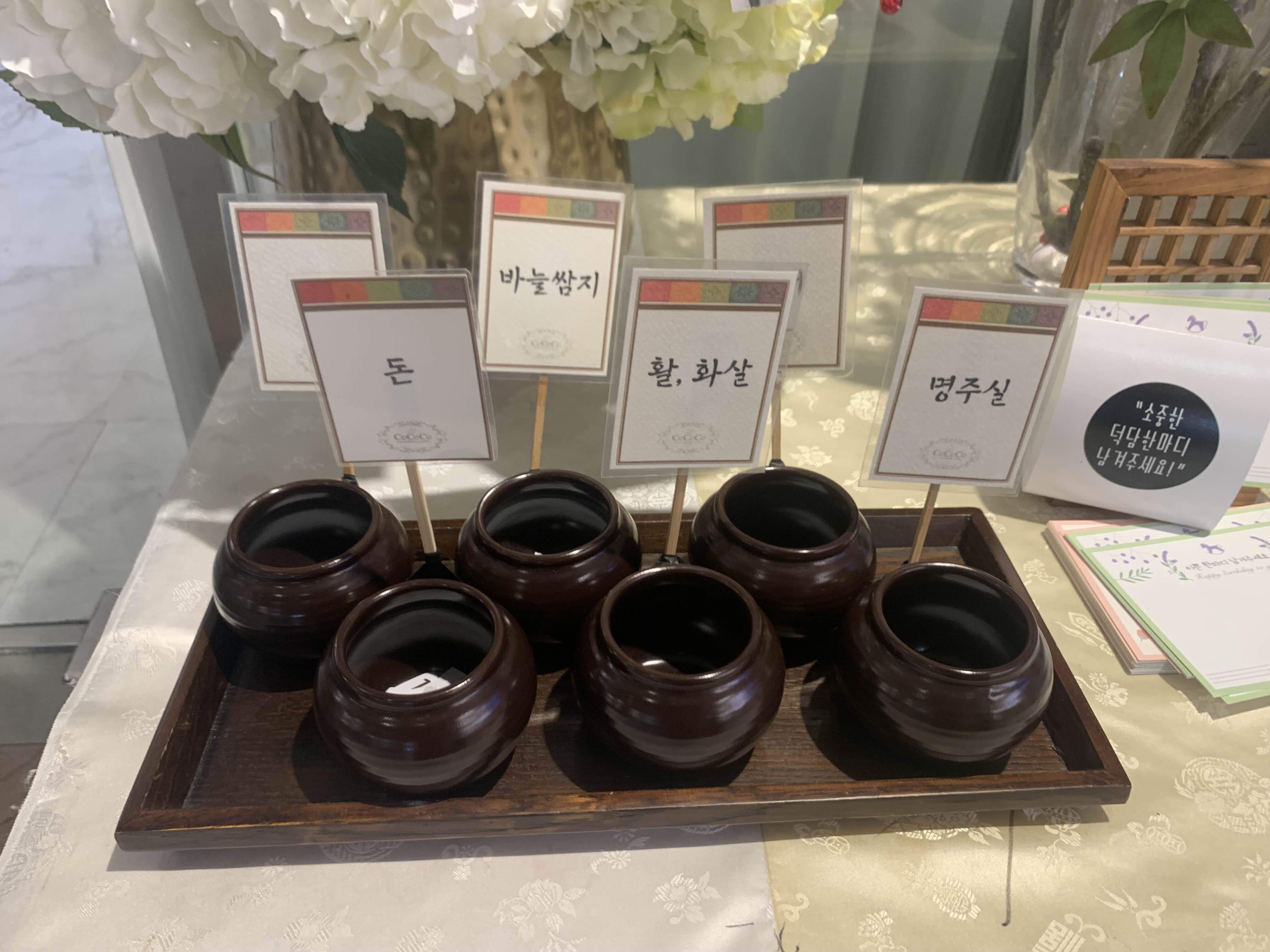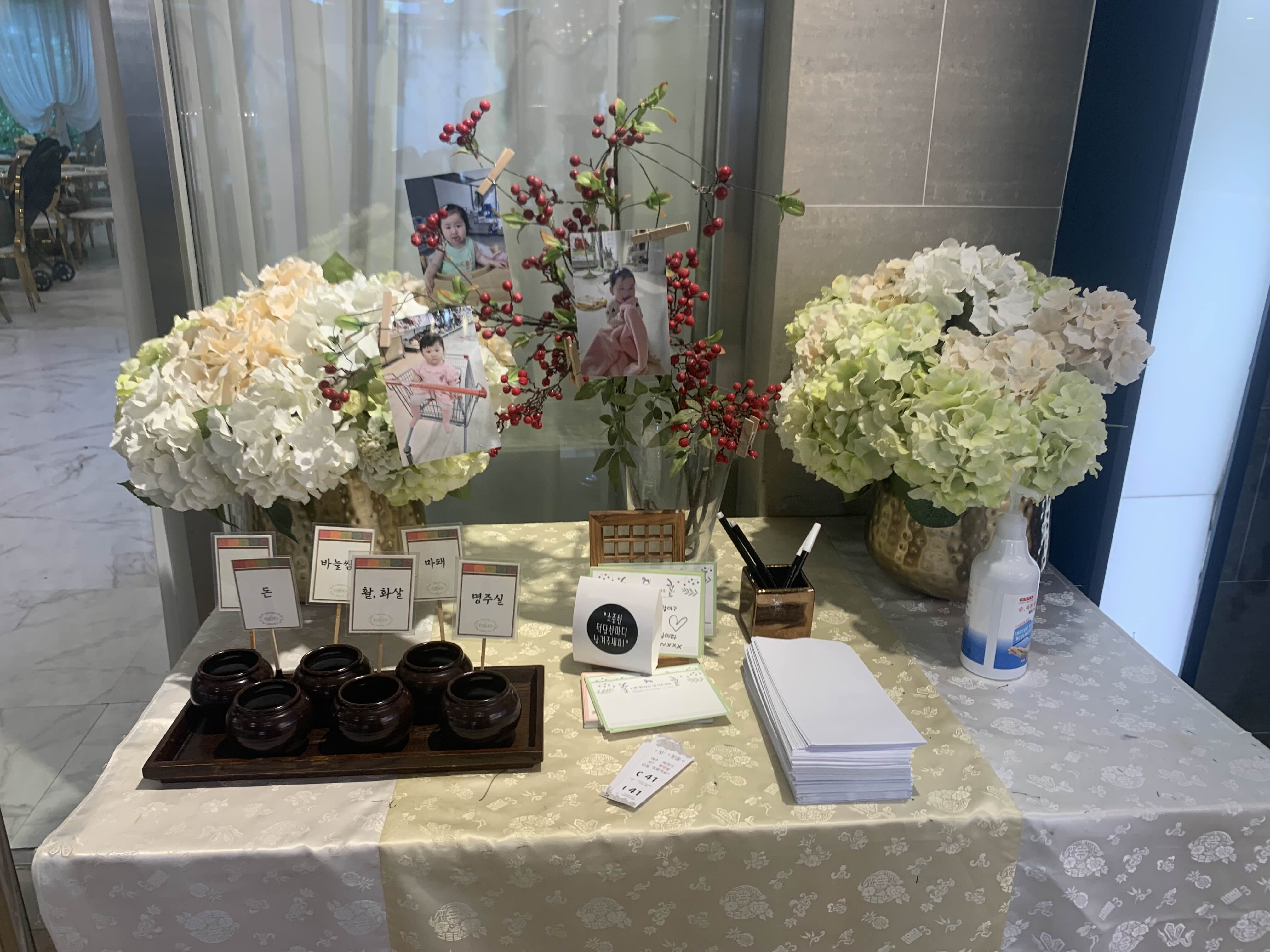 내가 이용했던 홀은 깔끔한 화이트 톤으로 되어 있어서 전반적으로 깔끔하고 럭셔리한 느낌이 정말 맘에 들었다. 또 내부장식이나 아기가 돌잡이 할 수 있는 걸로 준비되어 있고, 각 홀마다 돌잔치 할 때 아이들 얼굴 스냅사진으로 꾸미게 되어 있었다.