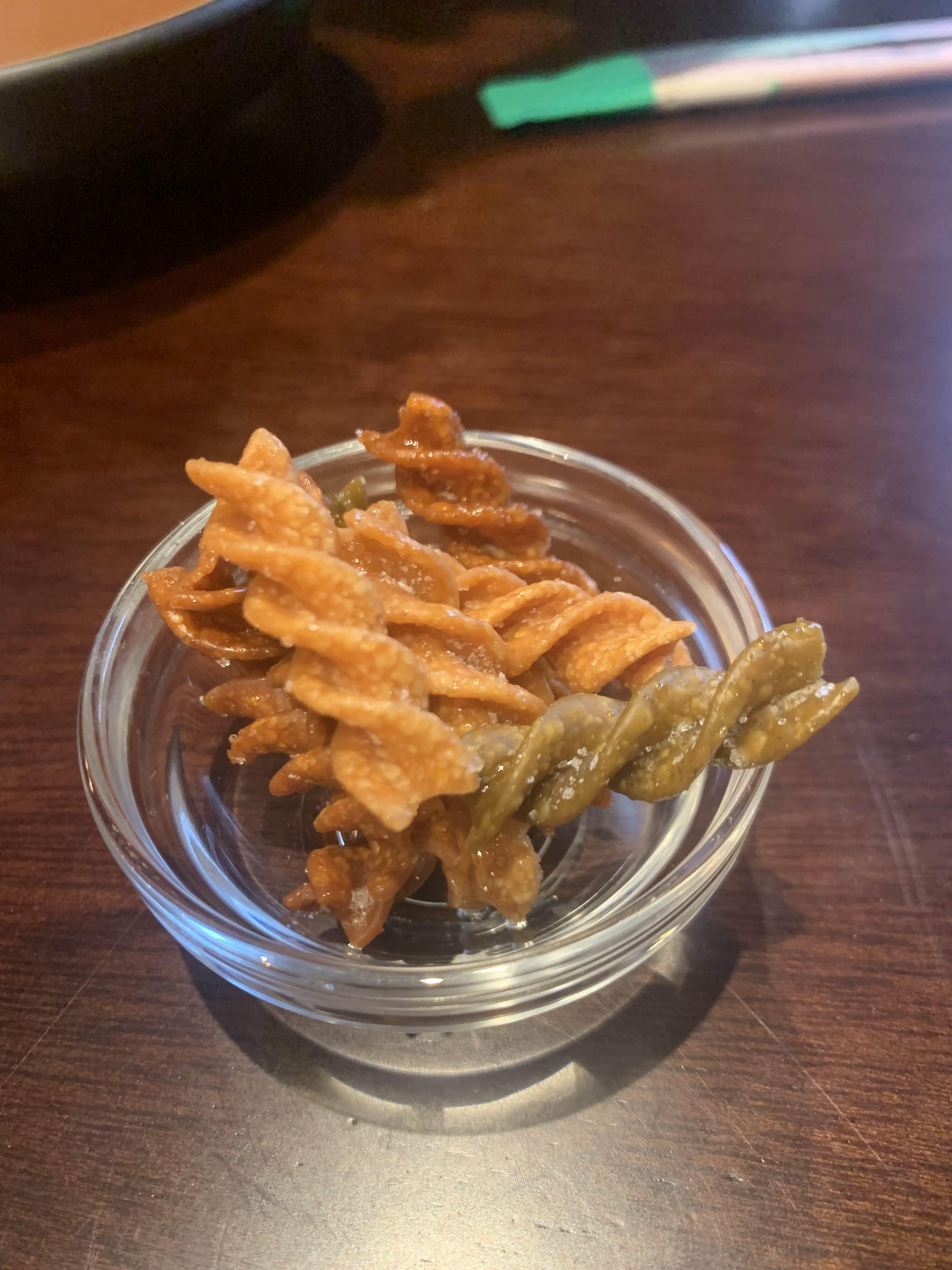 그리고 여기에 기본으로 나오는 안주도 있는데 파스타 튀김인데