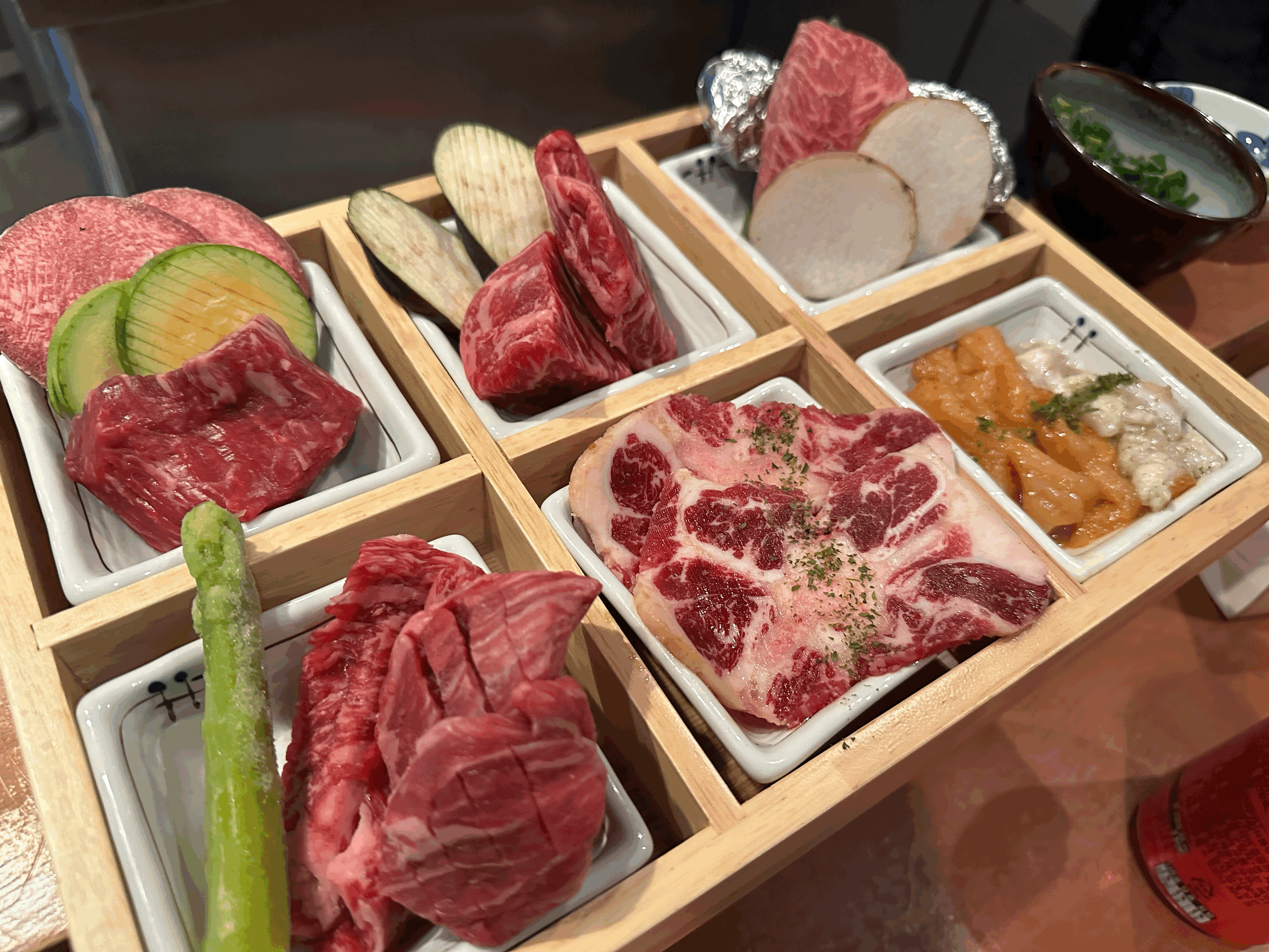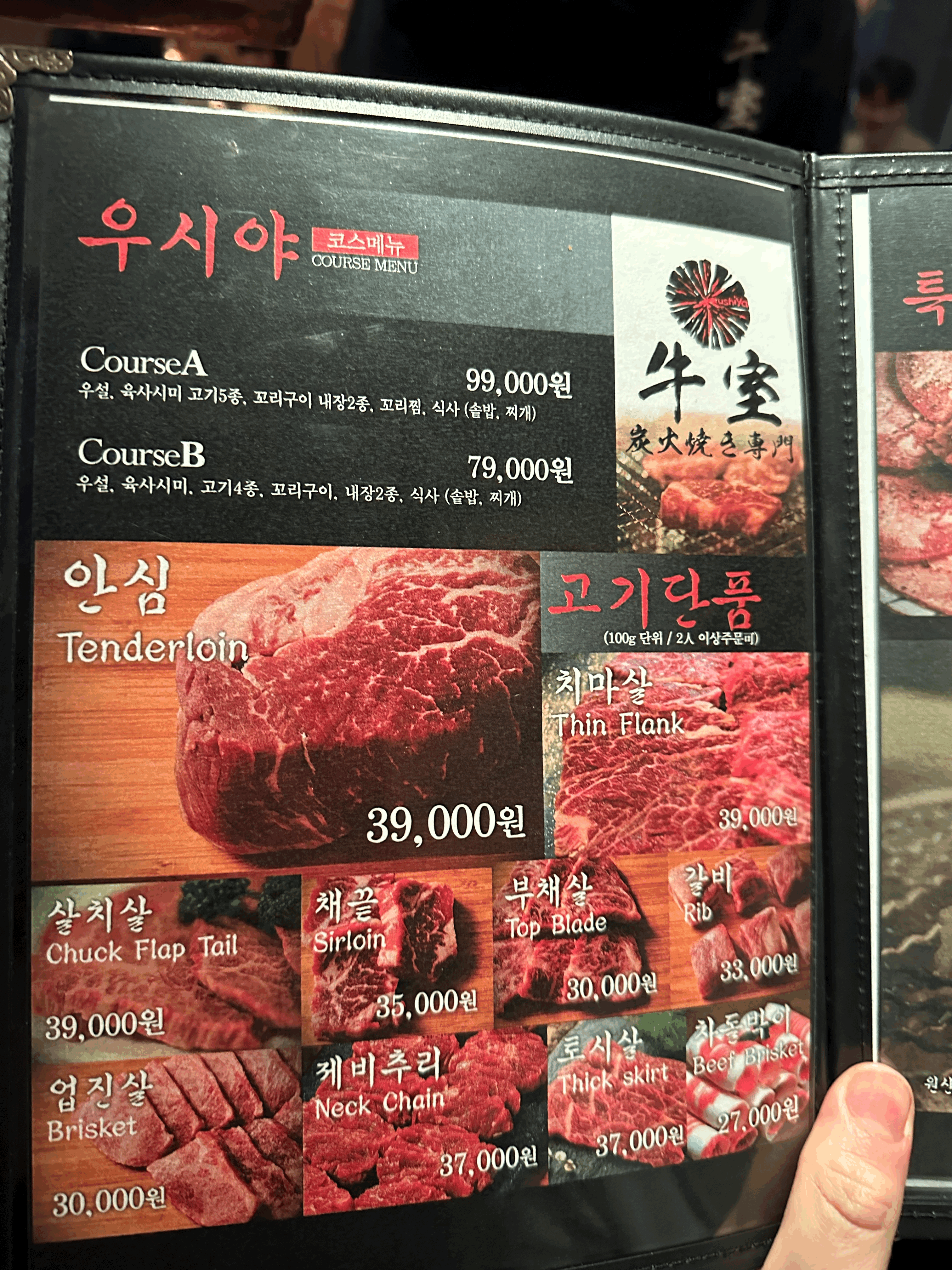 우설, 육사시미, 고기, 꼬리구이, 내장, 꼬리찜, 솥밥과 찌개로 이루어진 식사메뉴인데, 꼬리찜과 고기 1종이 있고 없고의 차이인데