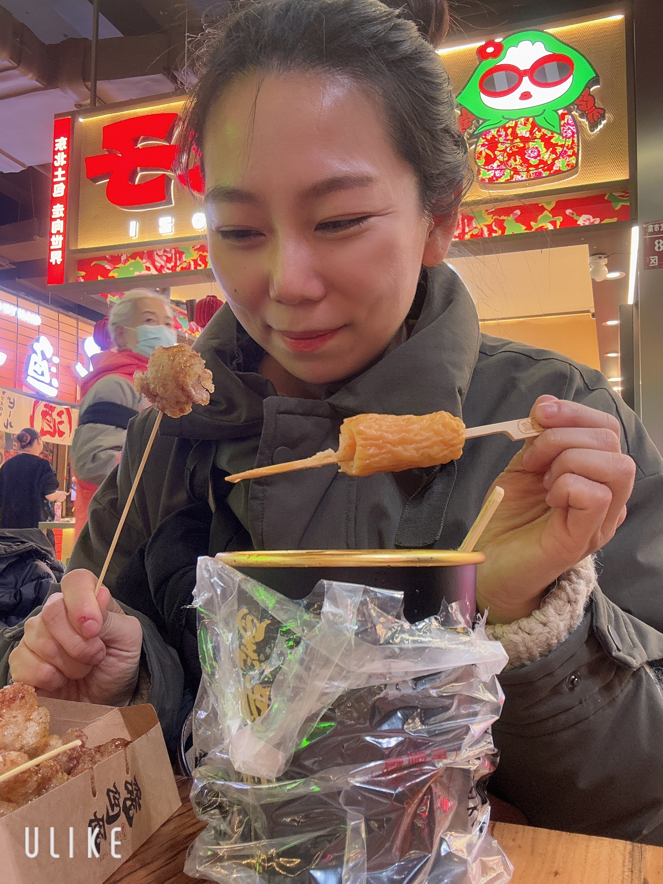 꿔바로우랑 꼬치랑 들고 어디서 먹어야 하는지 물어보려고 하는데 먹을 수 있는 장소가 바로 나왔다